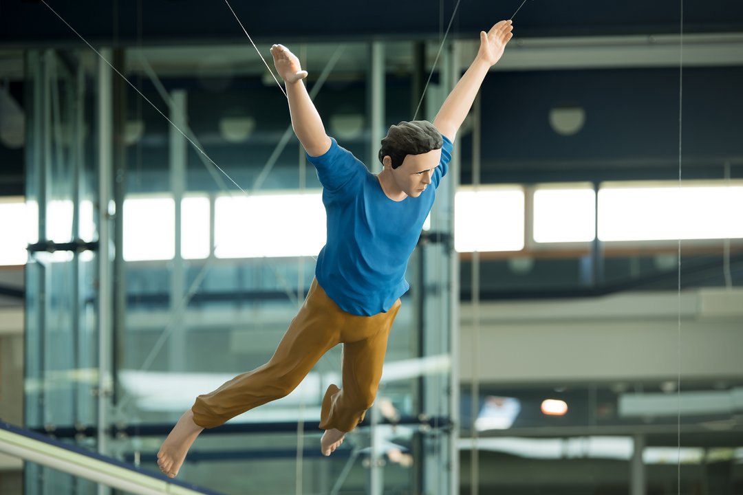 Mit entspannten Gesichtszu?gen und ge?ffneten Augen, die nichts zu fixieren scheinen, aufgekrempelten ?rmeln und ausgestreckten Armen h?ngt der Flying Man in leichter Schr?glage an du?nnen Stahlseilen unter der Decke. Seine legere Kleidung erweckt den Eindruck, dass sie sich im Luftstrom bewegt. Farblich hebt sich die Kleidung des Fliegenden komplement?r von seiner Umgebung ab. Das kobaltblaue Shirt kontrastiert die orange Deckenfenstereinfassung, die ockerfarbene Hose die dunkelblauen Stahltr?ger. Auch die Platzierung der Figur ist exakt kalkuliert: Eine Frontalansicht der Figur ist nur an der Treppe ins Untergeschoss gegeben, wodurch der Eindruck von Raumh?he bzw. -tiefe noch verst?rkt wird. Mit der lockeren K?rperhaltung und Mimik erinnert die Plastik eher an einen fliegenden als an einen herabstu?rzenden Menschen.