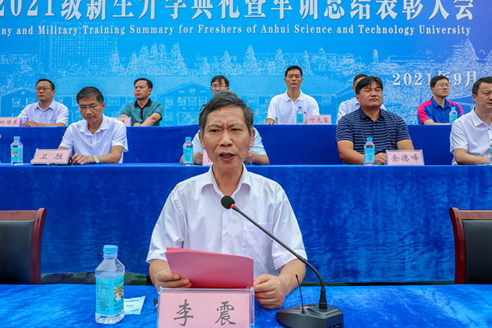 李震在开学典礼上致辞。他首先代表学dafabet官网,dafabet888官网和全体师生员工向2021级新同学的到来表示热烈欢迎,向辛勤培养新生的父母和老师表示崇高敬意,向长期关心、支持我校建设与发展并承担军训任务的解放军陆军装甲兵学院蚌埠校区的领导和教官表示衷心感谢,并介绍学校的办学历程及近年来取得的办学成就。他指出,安徽科技学院建于1950年,1965年开始举办本科教育,办学71年来,已累计输送10万多名优秀毕业生。现已发展成为一所办学历史悠久、文化底蕴深厚、多学科协调发展的省属本科院校。近年来,学校各项事业取得长足发展,实现新的突破,龙湖校区投入使用,“一校两区、协调发展”的办学格局已经形成。他强调,迈进新时代,学校将以习近平新时代中国特色社会主义思想作为指导,全面贯彻党的教育方针,落实立德树人的根本任务,按照第三次党代会确定的“三步走”发展战略,朝着“十四五”时期更名为大学,2035年建设成“现代化全国一流应用型大学”的目标砥砺前行。