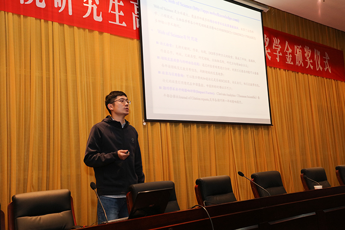 颁奖仪式后,江南大学刘晖博士以“Web of Science及其在选题中的应用”为题作了主题报告,结合自己的科研经历与学校研究生深入交流。