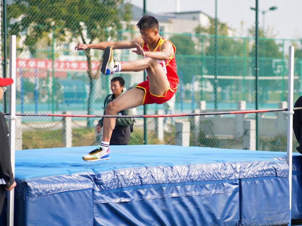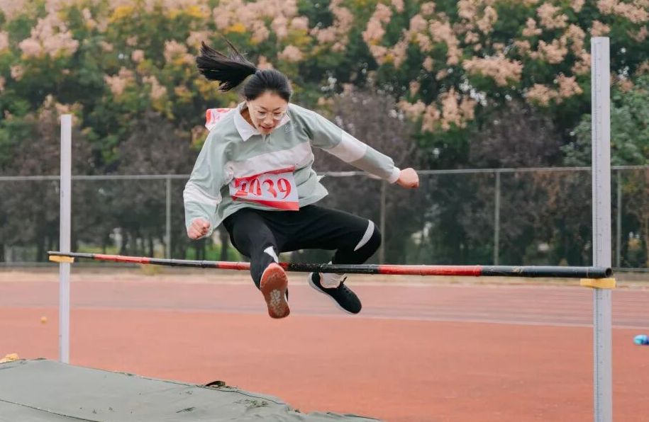 女子跳高的赛场上赛事正酣。随着横杆高度的一次次调升,运动员们一个个调整角度,寻找最佳发力点飞跃横杆。来自外国语学院英语专业2018级的学生张家庆在一段助跑后完美起跳,在空中划出一道优美的弧线,后落地迅速收脚、起身,动作干净利落、一气呵成,引得周围学生阵阵赞叹。最终,张家庆以1.26米的成绩夺得了女子跳高的桂冠。