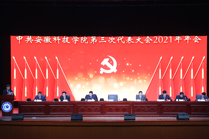 1月16日上午8时,中共安徽科技学院第三次代表大会2021年年会在凤阳校区大学生活动中心开幕。党委书记蒋德勤,党委副书记、院长李震,党委委员、副院长黄远友,党委委员、纪委书记、监察专员王强,党委委员、副院长黄友锐,党委委员、副院长李升和,党委委员、宣传(统战)部部长卫胜,党委委员、组织部部长钱锐出席会议并在主席台就座。