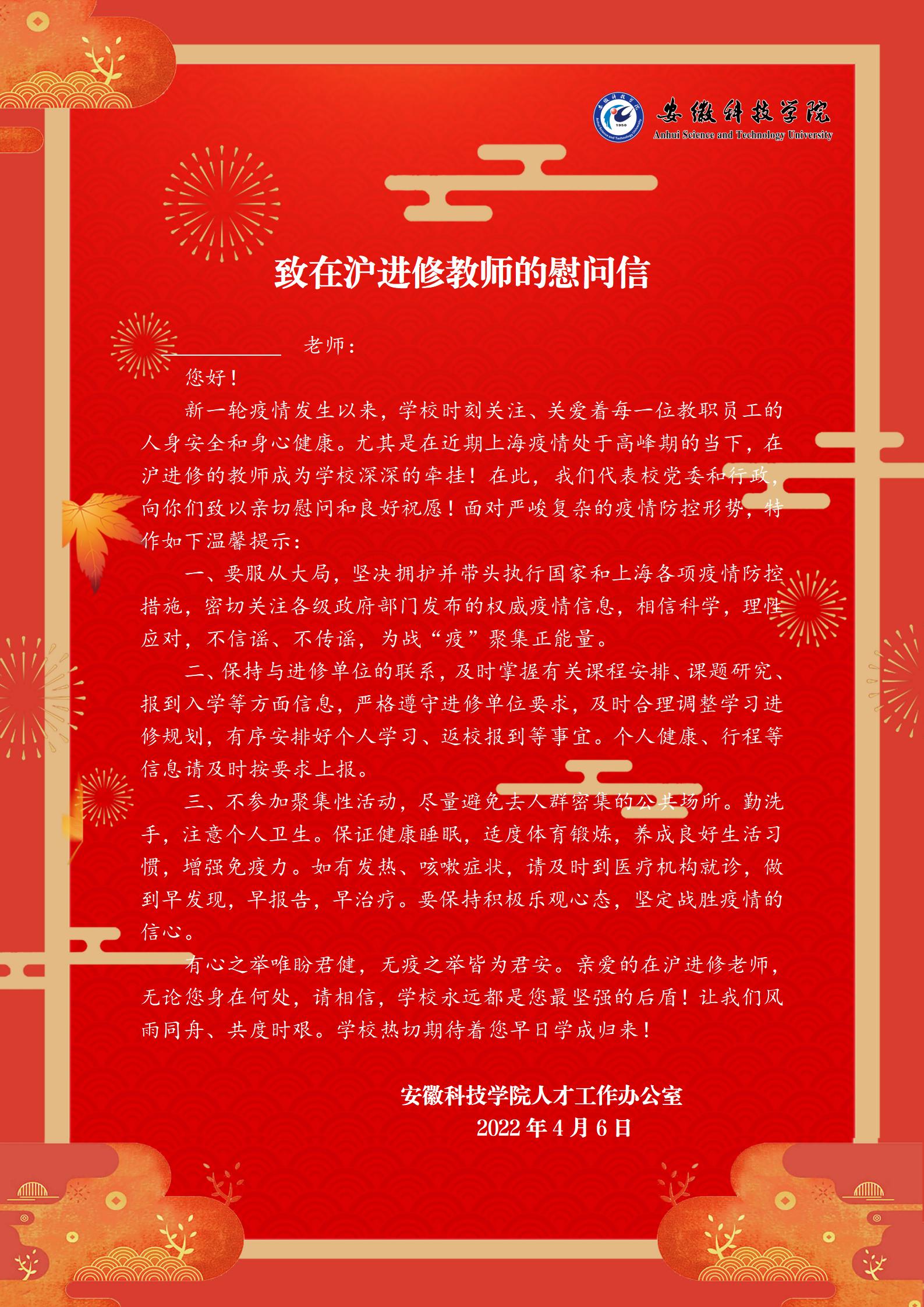 新一轮疫情发生以来,学校时刻关注、关爱着每一位师生员工的人身安全和身心健康。尤其在近期上海疫情处于高峰期的严峻形势下,在沪进修的教师成为学校深深的牵挂。近日,受校党委、行政委托,校人才工作办公室向仍坚持在沪进修深造的教师,发去慰问信和慰问金。