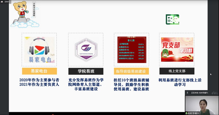 本期思政沙龙分为线上分享、线下讨论两部分组成。线上分享由全国“优秀易班辅导员”化学与材料工程学院李潮升做《网络育人,易起同行》经验分享,她从学院易班建设、支部易班建设、个人工作感悟三方面进行了分享,尤其围绕院级易班+特色栏目;班级易班+实践活动;易班+党建三大板块的建设背景、建设思路、具体做法进行了详细阐述。其交流过程中的“纸上得来终觉浅,绝知此事要躬行”“工欲善其事,必先利其器”的观点让与会人员获益良多。线下讨论陈君君对如何探索加强和完善“易班”平台建设的有效方法,如何为“易班”平台建设注入活水,激发活力,增强学生对“易班”的认同感进行了总结。