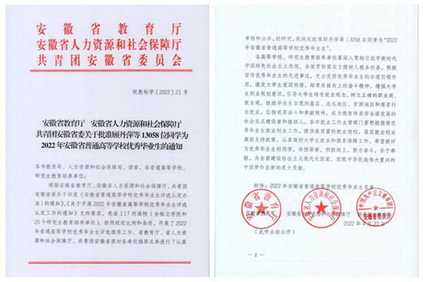 日前,安徽省教育厅、安徽省人力资源和社会保障厅、共青团安徽省委员会下发了《关于批准顾丹萍等13058位同学为2022年安徽省普通高等学校优秀毕业生的通知》,我校方圆等125名同学被授予“2022年安徽省普通高等学校优秀毕业生”荣誉称号。