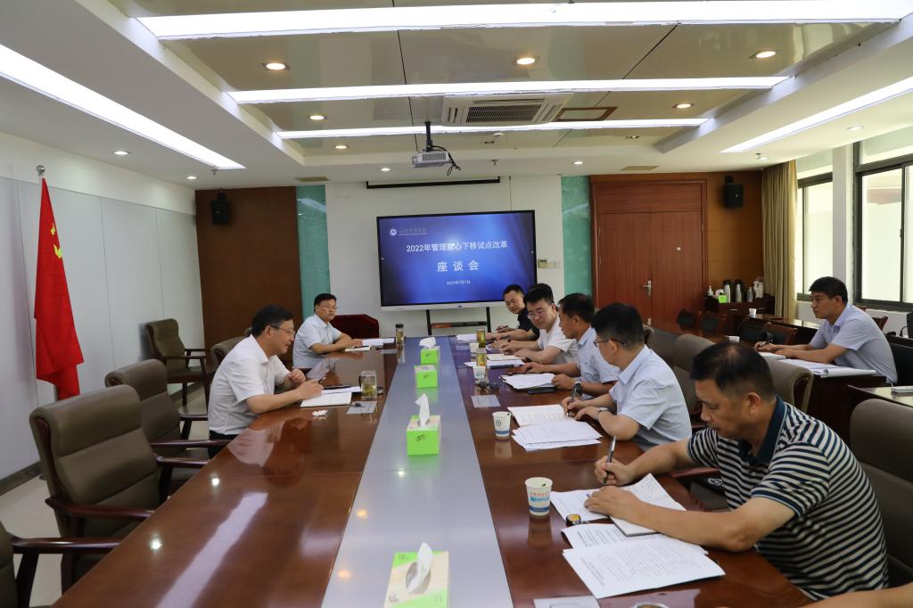 为全面总结近两年来管理重心下移试点改革及第一批、第二批权限清单推进落实情况,深化拓展试点工作成效,深入推进“放管服”改革,7月7日上午,校党委委员、副院长黄远友在新图书馆十楼会议室主持召开管理重心下移试点改革座谈会。机械工程学院、管理学院、资源与环境学院等三个试点单位党政主要负责人,教务处、科研处、财务处、人事处等部门主要负责人参加会议。