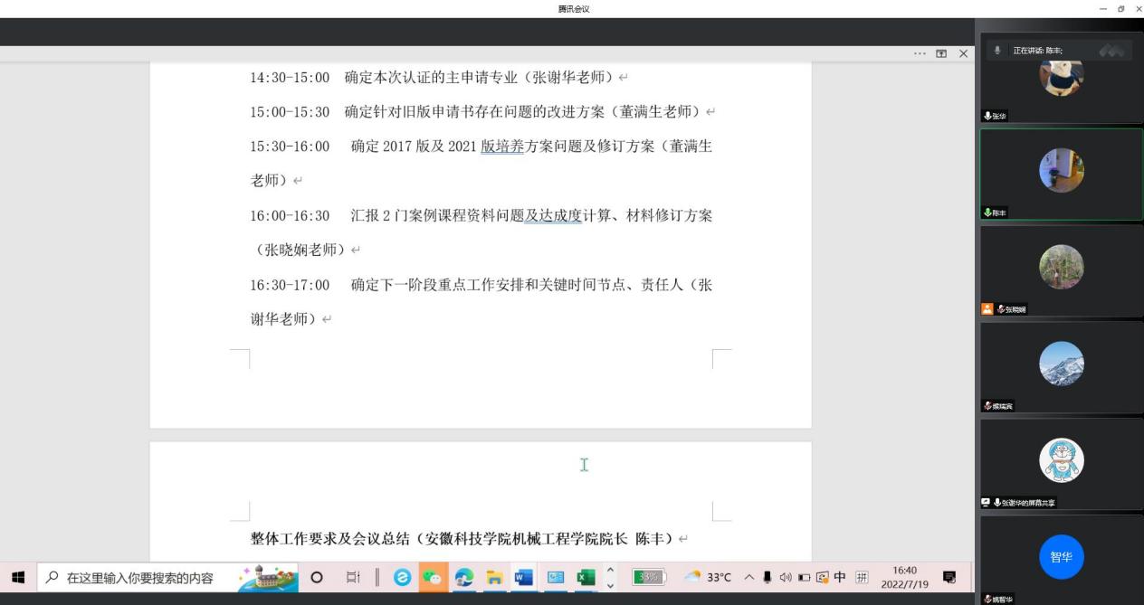 会议后半程,双方就下一步重点推进的工作计划和时间节点进行了商讨并达成共识,力争在暑假结束前完成2022专业认证申请书的初稿撰写和附件材料的准备工作。