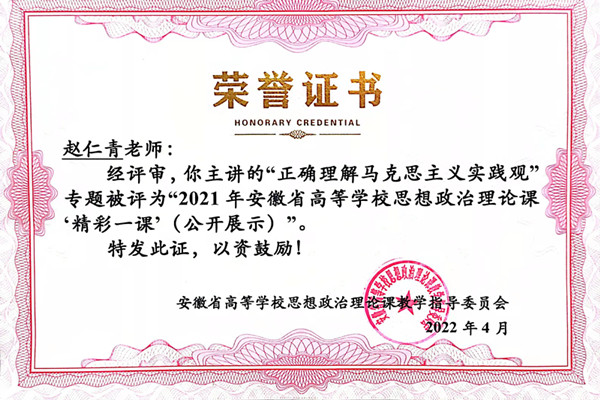近日,从安徽省高校思政课教学指导委员会获悉,我校马克思主义学院赵仁青老师主讲的《正确理解马克思主义实践观》被遴选进入省教育厅“三全育人”提升计划50个“精彩一课”立项项目,并顺利入围安徽省智慧思政课教学平台10个公开展示专题。