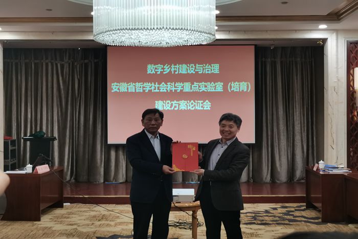 12月17日下午,学校在合肥召开数字乡村建设与治理安徽省哲学与社会科学重点实验室建设方案专家论证会。论证专家组由中国工程院院士杨善林、安徽理工大学党委副书记余玉刚,安徽省社科联副主席周祥飞,合肥工业大学管理学院副院长姜元春,中国科学技术大学管理学院副院长刘和福等7位专家组成。校党委书记蒋德勤,党委委员、副院长李升和,科研处处长陈丰,管理学院院长陈传万,管理学院副院长郑谦等参加了会议。会议由蒋德勤主持。
