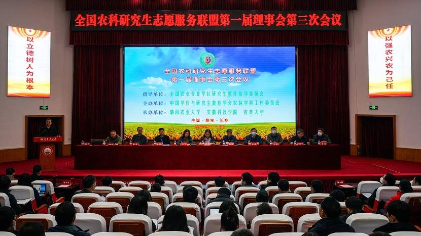 2月12日,由中国学位与研究生教育学会农林学科工作委员会主办,湖南农业大学、安徽科技学院和吉首大学联合承办的全国农科研究生志愿服务联盟(以下简称“联盟”)第一届理事会第三次会议在湖南农业大学修业讲堂召开。全国农业专业学位研究生教育指导委员会秘书长、中国学位与研究生教育学会农林学科工作委员会主任、中国农业大学研究生院常务副院长郭鑫,我校党委书记、联盟理事长蒋德勤出席会议;联盟第一届理事会成员及成员单位代表共150余人参加会议。我校党委委员、副校长、联盟秘书长李升和,研究生处处长张春雨、副处长靳二辉参加会议。