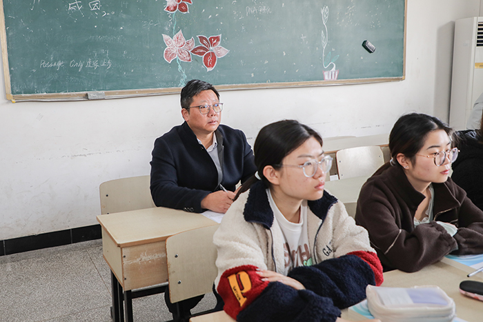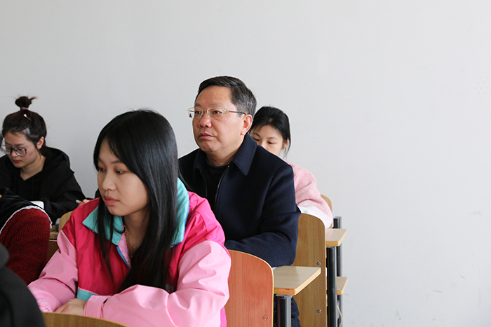 黄远友、李升和也按照既定听课方案,分别深入龙湖校区致知楼A303教室和凤阳校区求知楼A403教室与同学们一起听课,并利用课间与师生进行交流,给予相关指导。