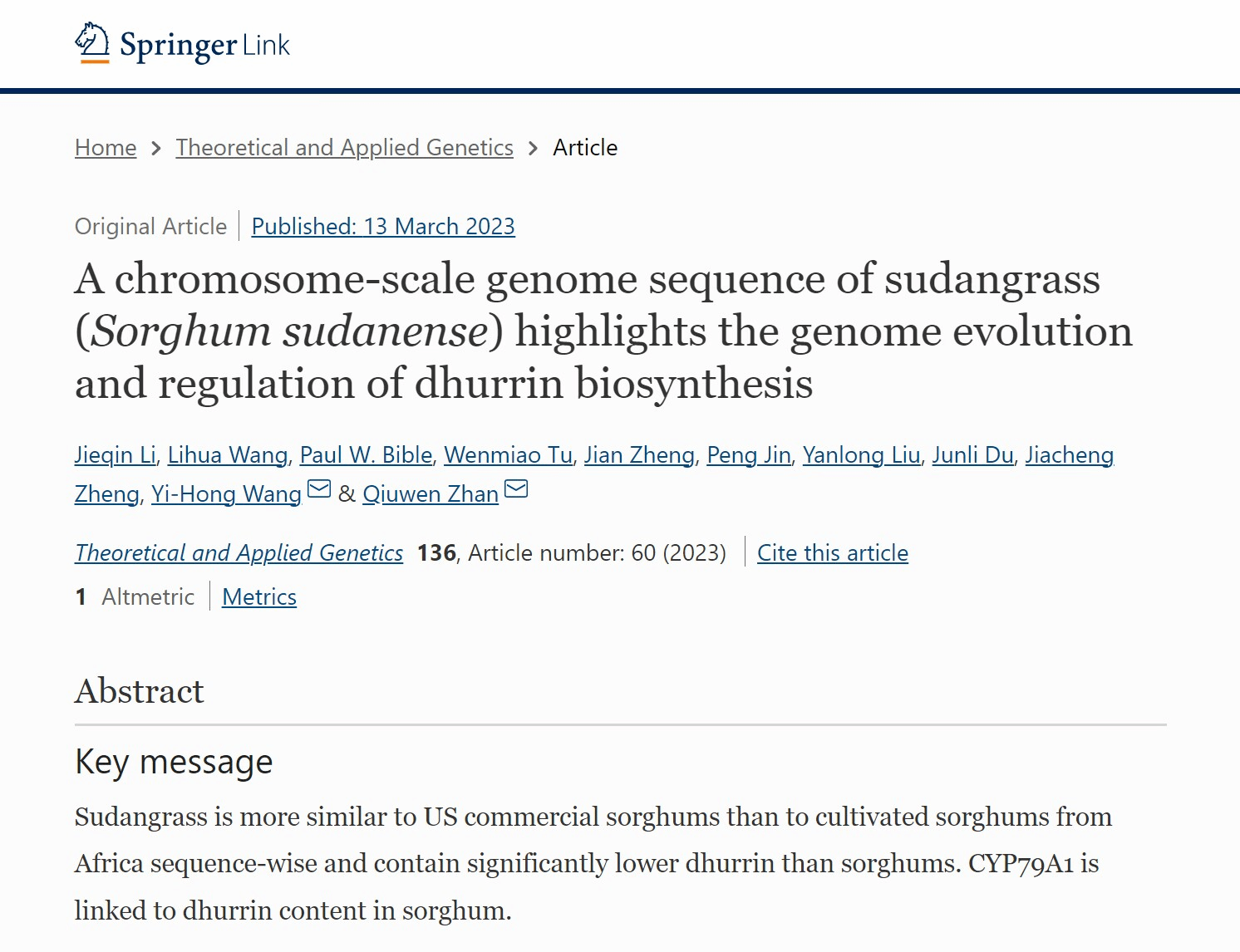 3月13日,由我校李杰勤教授、王丽华老师和美国马里安大学(Marian University)Paul W. Bible教授为共同第一作者,我校詹秋文教授、美国路易斯安那大学拉法叶分校Yi-Hong Wang教授为共同通讯作者的论文“A chromosome?scale genome sequence of sudangrass (Sorghumsudanense) highlights the genome evolution and regulation of dhurrin biosynthesis”,在国际著名学术期刊《Theoretical and Applied Genetics》(中国科学院一区)在线发表。该研究在全球首次破译了苏丹草的基因组,对促进苏丹草和饲用高粱及高丹草(高粱-苏丹草杂交种)的品种改良具有重要意义。
