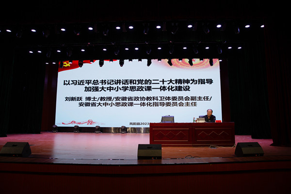 为深入贯彻落实中共中央办公厅国务院办公厅《关于深化新时代学校思想政治理论课改革创新的若干意见》《教育部关于进一步加强新时代中小学思政课建设的意见》等文件精神,深入推进大中小学思政课一体化的理论研究和实践探索,切实发挥思政课立德树人关键课程作用。5月13日至14日,由安徽科技学院、凤阳县教育体育局联合主办,马克思主义学院承办的凤阳县2023年大中小学思政课一体化建设骨干教师培训班顺利举办。全县115名中小学思政课骨干教师和马克思主义学院部分教师参加了专题培训。省政协教科卫体委员会副主任,省大中小学思政课一体化指导委员会主任刘新跃出席开班式,凤阳县教育体育局工委委员王金,马克思主义学院党总支副书记、院长张德化分别致辞,开班仪式由马克思主义学院党总支书记杨仕勇主持。