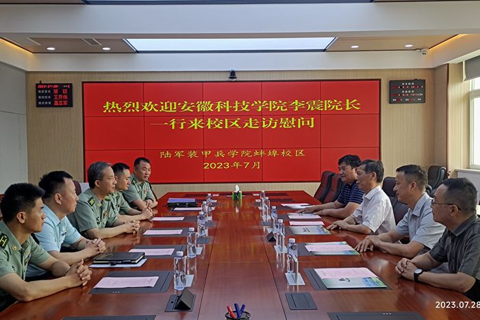 7月28日上午,在“八一”建军节即将来临之际,校党委副书记、院长李震赴军学共建单位陆军装甲兵学院蚌埠校区看望慰问官兵,送去慰问品和节日祝福。陆军装甲兵学院蚌埠校区大校政治委员曾文勇和教学科研处、教练勤务营等部门负责人参加慰问座谈会。校党委学工部、人民武装部负责人等陪同慰问。