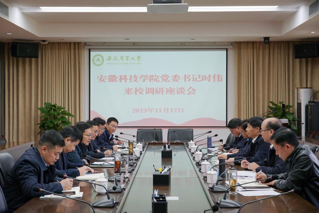 时伟向安徽农业大学介绍了安徽科技学院的基本校情及近年来改革、建设与发展情况,详细听取了安徽农业大学近年来改革、建设与发展情况的介绍,特别是该校在学科专业建设、人才队伍建设、科研管理及产学研合作等方面取得的显著成效、积累的成功经验。