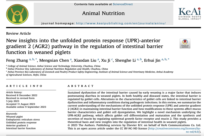 11月15日,我校动物科学学院张峰博士在《Animal Nutrition》杂志发表“New insights into the unfolded protein response (UPR)-anterior gradient 2 (AGR2) pathway in the regulation of intestinal barrier function in weaned piglets”综述论文。《Animal Nutrition》杂志现位列中国科学院SCI农林科学大类一区、奶制品与动物科学小类一区,最新影响因子为6.3,在动物科学领域期刊中属Top期刊(3/62)。