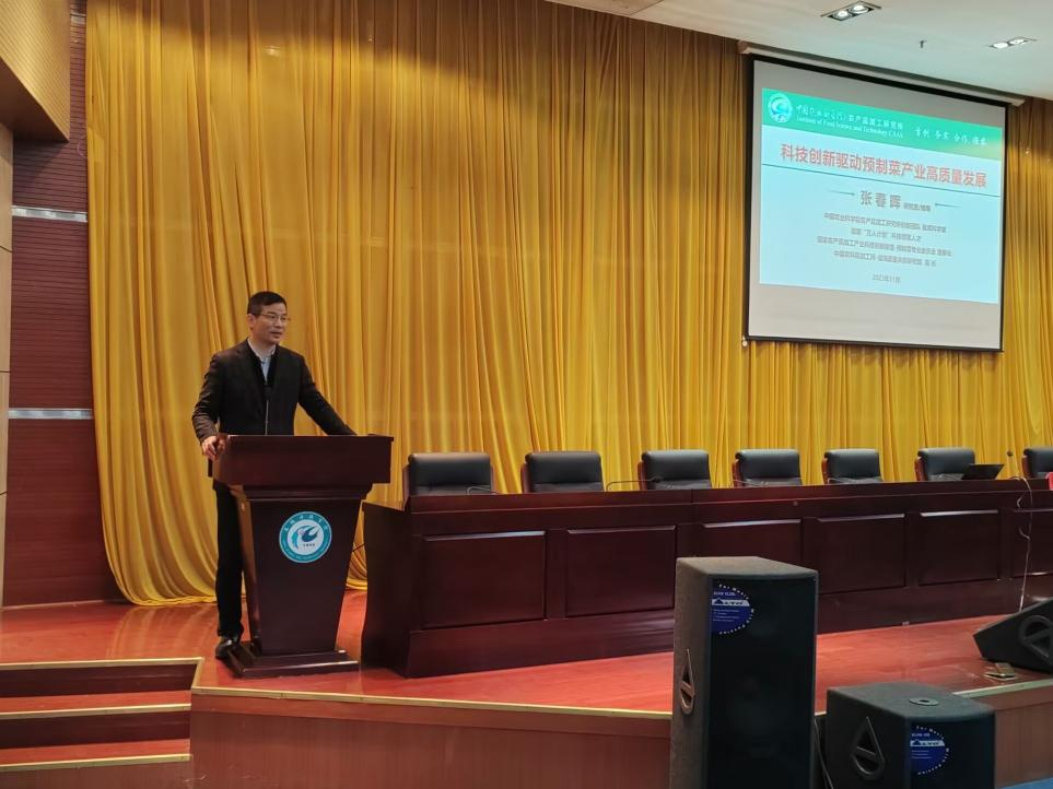 学术报告会由食品工程学院院长杜传来主持。张春晖以“科技创新驱动预制菜产业高质量发展报告”为题,深入分析了科技创新在预制菜产业发展中的重要性及其应用,提出了科技创新驱动预制菜产业高质量发展的未来发展方向。