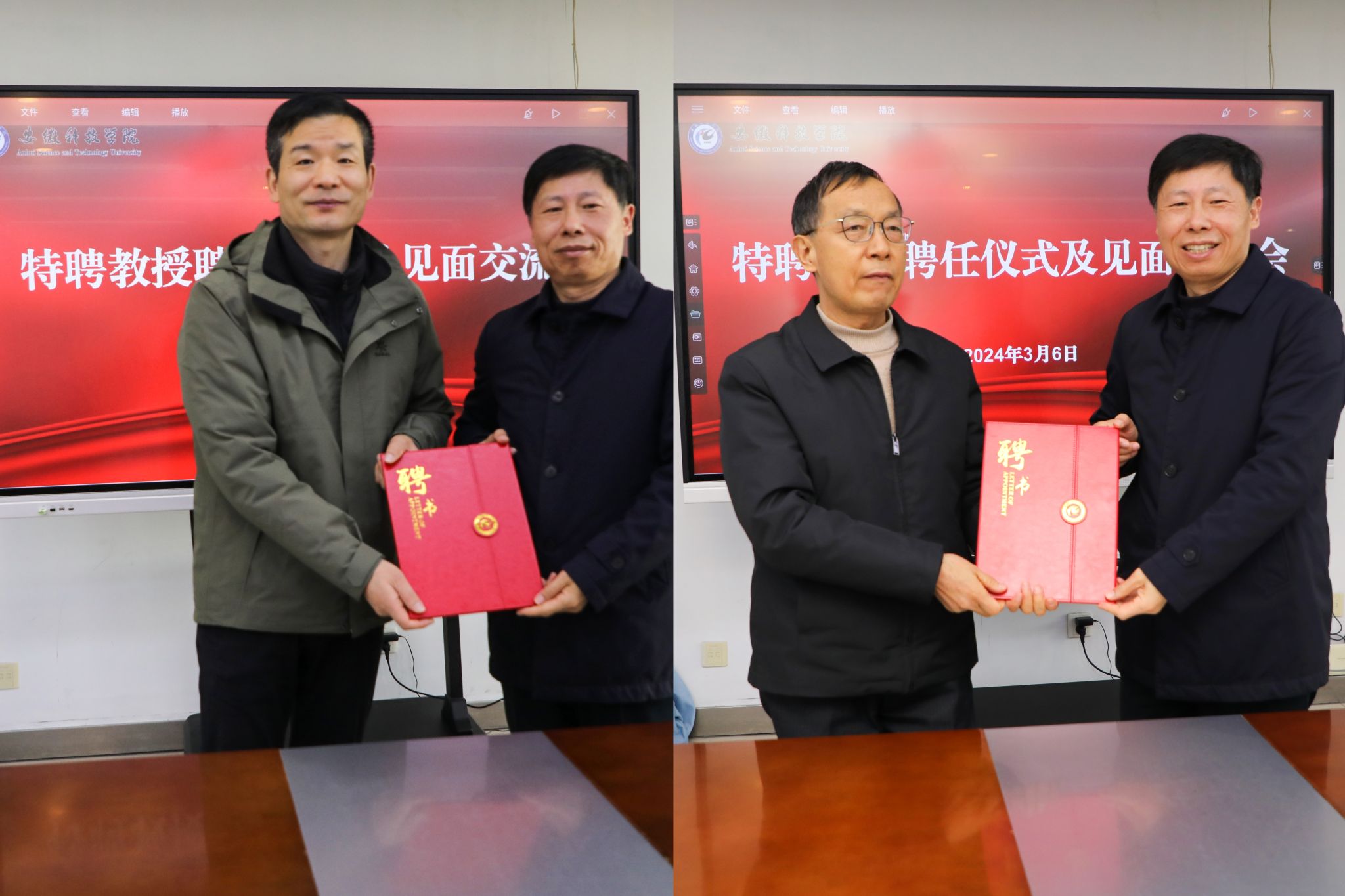张春晖、王长路在发言中感谢学校的信任与聘任,他们表示将以高度的责任感和使命感履行岗位职责,把科技成果转化为育人优势,为安徽科技学院科研工作多作贡献。