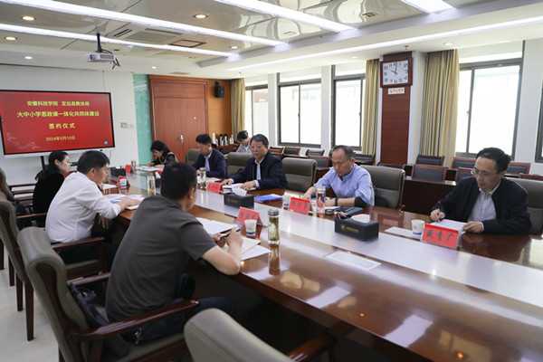 为深入学习贯彻习近平总书记关于学校思政课建设的重要指示批示,深入推进大中小学思想政治教育一体化建设,5月10日下午,我校与定远县教体局在凤阳校区图书馆十楼会议室签订大中小学思政课一体化共同体建设协议。校党委委员、副院长李升和出席并讲话。定远县教体局工委副书记黄如勇,我校马克思主义学院党总支书记杨仕勇出席签约仪式。马克思主义学院党总支副书记、院长张德化主持签约会议。