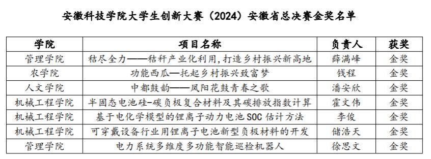 近日,安徽省大学生创新大赛(2024)获奖名单公布,我校共获奖47项,其中参赛项目“功能西瓜—托起乡村振兴致富梦”“中都鼓韵——凤阳花鼓青春之歌”“电力系统多维度多功能智能巡检机器人”等7个项目获省赛金奖,“节尽所能——智控节能搭快车助力全球节能发展”等17个项目获省赛银奖,“创维新视界”——基于新型氧化钨智能变色引领者”等23个项目获省赛铜奖。省赛金奖数量及获奖总数在省内地方应用型高校中排在前列,学校获优秀组织奖,郑谦、吴燕、张聪、查文珂、但文蛟、董福龙等6位老师获优秀创新创业导师奖。
