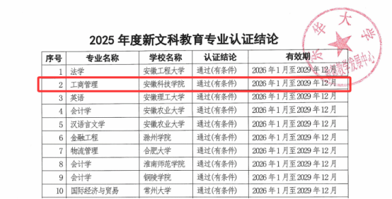 12月26日,长三角新文科教育专业认证联盟发布《关于公布2025年度新文科教育专业认证结论的通知》,我校工商管理专业顺利通过认证(有条件),有效期自2026年1月至2029年12月,成为我校继财务管理专业后第二个通过长三角新文科教育专业认证的专业。