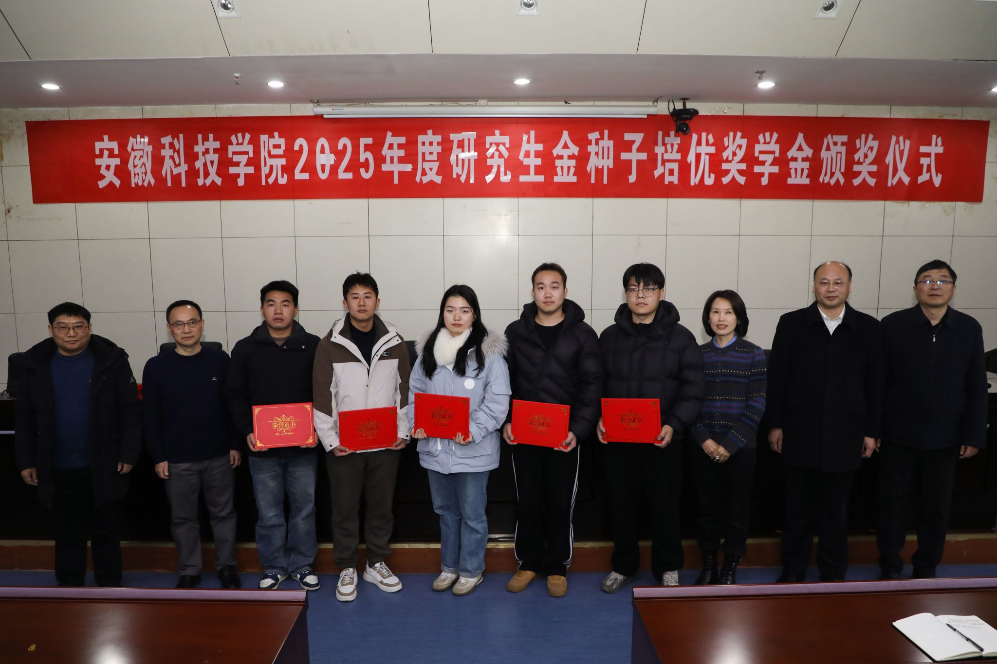 王孝义代表学校向5位获奖同学表示祝贺,向奖学金发起方及长期关心支持学校发展的社会各界人士致以诚挚感谢。他指出,“金种子”寓意着希望与潜力,获奖同学是学校研究生群体的优秀典范,其成长成才生动诠释了新时代青年的责任与担当。他对全体研究生提出三点希望:一是以荣誉为新起点,戒骄戒躁、精益求精,在学术道路上勇攀高峰;二是以榜样为标尺,示范引领、携手共进,营造比学赶超的良好氛围;三是以初心为指引,胸怀家国、勇担使命,将个人理想融入国家发展大局,把论文写在祖国大地上,为农业现代化建设和乡村振兴战略实施贡献安科力量。同时,他要求全体研究生导师坚守教育初心、牢记育人使命,既做知识的传播者,更做学生成长的引路人,以言传身教培育学生的学术素养与家国情怀,助力每一颗“金种子”在优质培育下茁壮成长。