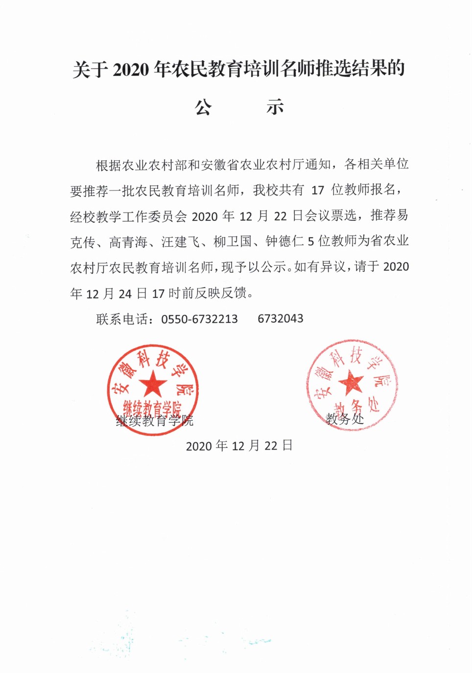 关于2020年农民教育培训名师推选结果的公示