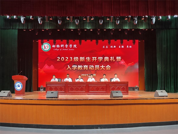 9月18日晚,动物科学学院在大学生活动中心召开2023级新生开学典礼暨入学教育动员大会。动物科学学院院长范红结,党委书记、副院长程斌,党委副书记、纪委书记汤帅,党委委员、副院长贺绍君,党委委员、动物医学系主任李文超,党委委员、党政办主任、团委书记李焱出席会议,全体新生辅导员及2023级新生参加会议。大会由汤帅主持。