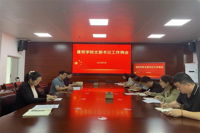 学院党政办公室主任靳盼传达了《中共安徽科技学院委员会组织部关于做好2021年立项校级党建工作“双创”项目验收工作的通知》《中共安徽科技学院委员会组织部关于开展2023年新时代党建示范创建和质量创优工作的通知》《建筑学院2023年下半年党员教育安排意见》《建筑学院2023年下半年教职工理论学习的安排意见》《关于抽查学生党员档案发现问题回复的函》。组织员吴婷婷布置了2023年下半年确定入党积极分子事宜。