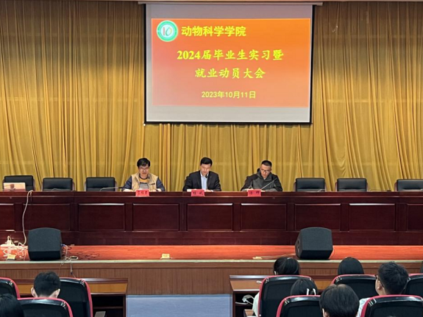 为扎实稳步地推进2024届毕业生实习就业工作,提高学生的社会适应能力,10月11日下午,动物科学学院于图书馆A座二楼报告厅召开2024届毕业生实习动员大会。学院党委书记、副院长程斌,党委副书记汤帅,党委委员、副院长贺绍君出席会议,毕业班辅导员及2024届全体毕业生参加会议,会议由程斌主持。