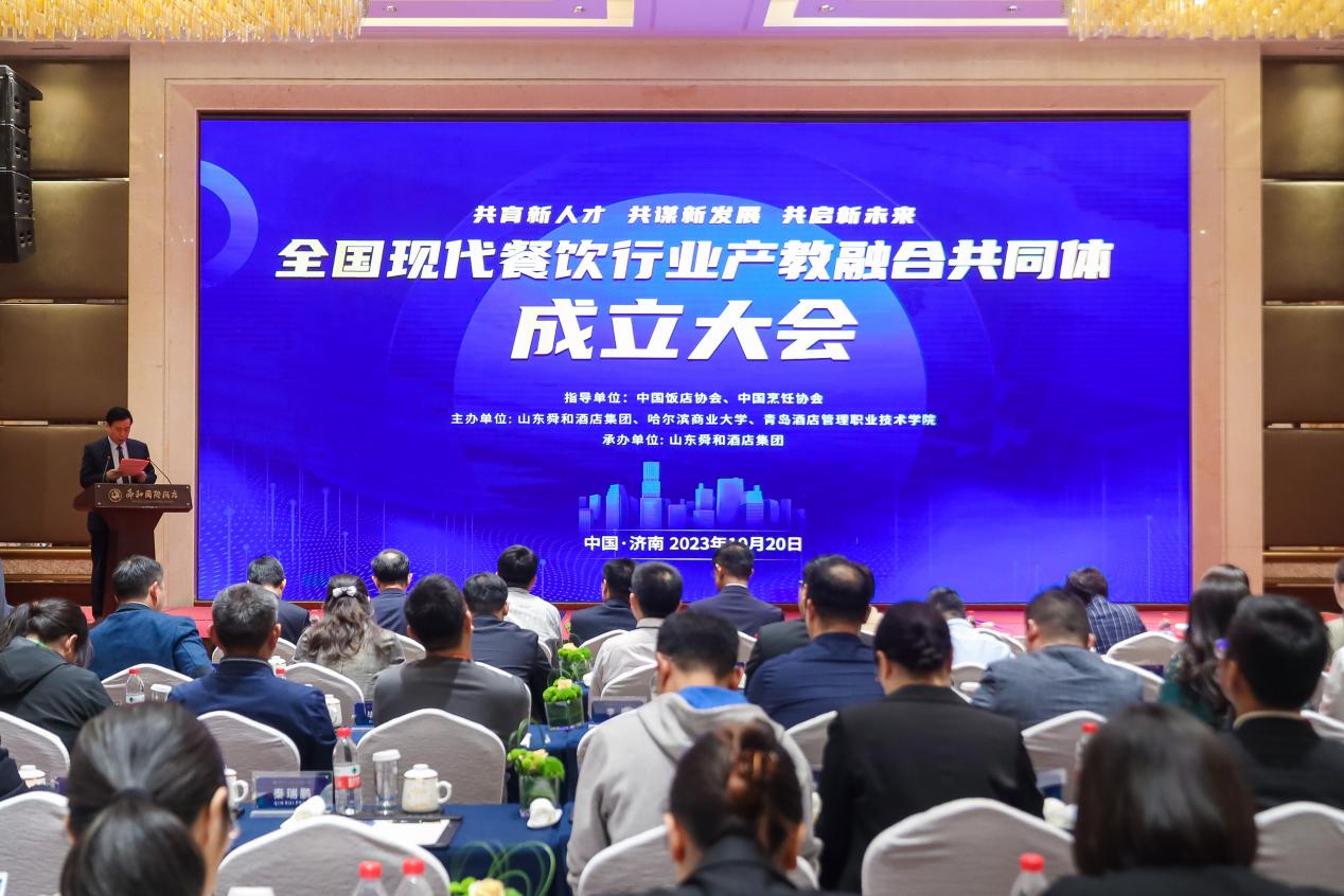 10月20日,全国现代餐饮行业产教融合共同体成立大会在济南召开,此共同体的成立旨在深入探索产教融合新路径,努力开创产教融合新格局。会议由哈尔滨商业大学、青岛酒店管理职业技术学院、山东舜和酒店集团有限公司牵头组织,有16所高等学校、58所职业院校、31家企业、4家行业协会、3家科研机构在内的112家单位共同参与。我校被授予常务理事单位,食品工程学院副院长郑海波和烹饪与营养教育专业教师代表刘勇受邀参加此次会议。