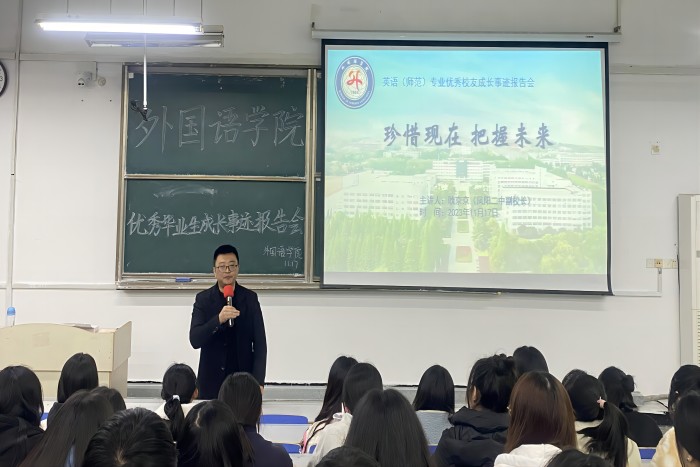 为厚植教育情怀,引导师范生做好职业规划,11月17日晚,外国语学院在求知楼A座106教室举办外国语学院英语(师范)专业优秀校友成长事迹报告会之三:珍惜现在,把握未来。本次报告会邀请了英语专业2007届优秀毕业生、凤阳县第二中学副校长耿京京分享个人成长事迹。2021级英语(师范)专业全体学生聆听报告。报告会由学院党委副书记张海亮主持。