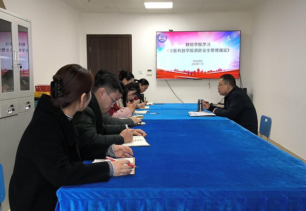学习法律法规,指导工作实践。11月20日,财经学院全体辅导员在西附楼212会议室学习《安徽科技学院消防安全管理规定(2023年修订)》,会议由学院党委副书记耿广汉主持。会上,辅导员共同学习了文件中和学院消防工作相关的内容,涉及消防安全责任、消防安全管理、消防安全检查和整改、消防安全教育和培训、灭火、应急疏散预案和演练等内容,指导辅导员在日常工作中教育引导学生防范消防安全隐患。