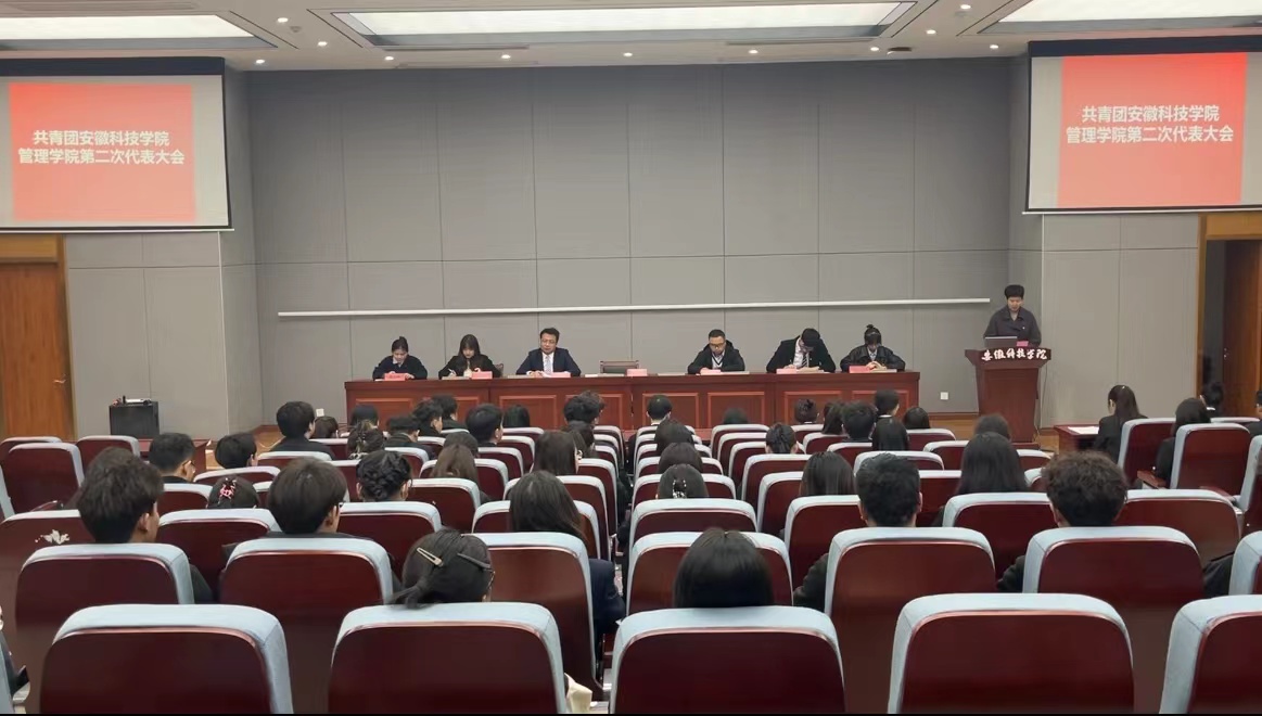 12月7日下午,共青团安徽科技学院管理学院第二次代表大会在龙湖校区敏行楼报告厅召开。学院党委副书记陶漫出席大会并致词,全体辅导员及55名团代表出席本次大会。副科级辅导员姚姝媛主持会议。