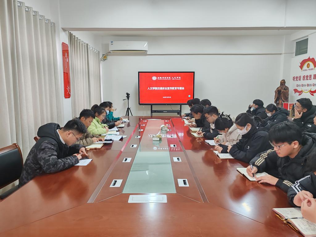 12月15日下午,人文学院在学知楼324召开交通安全宣传教育专题会议,学院党政领导、全体专职辅导员及各班班长、学习委员参加,会议由学院团委副书记焦雪松主持。