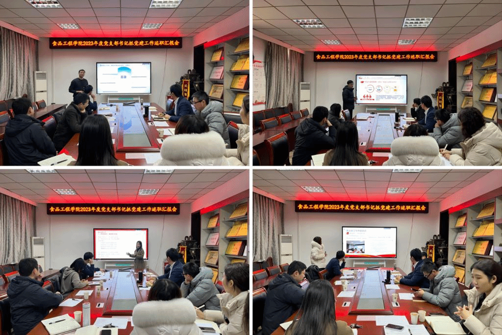 12月29日下午,食品工程学院召开2023年度党支部书记抓党建工作述职汇报会。学院党委书记付光玺出席并主持会议,副院长翟立公列席指导,食品营养与安全系教工党支部、食品科学与工程学生党支部等7个党支部的支部书记参加述职汇报。