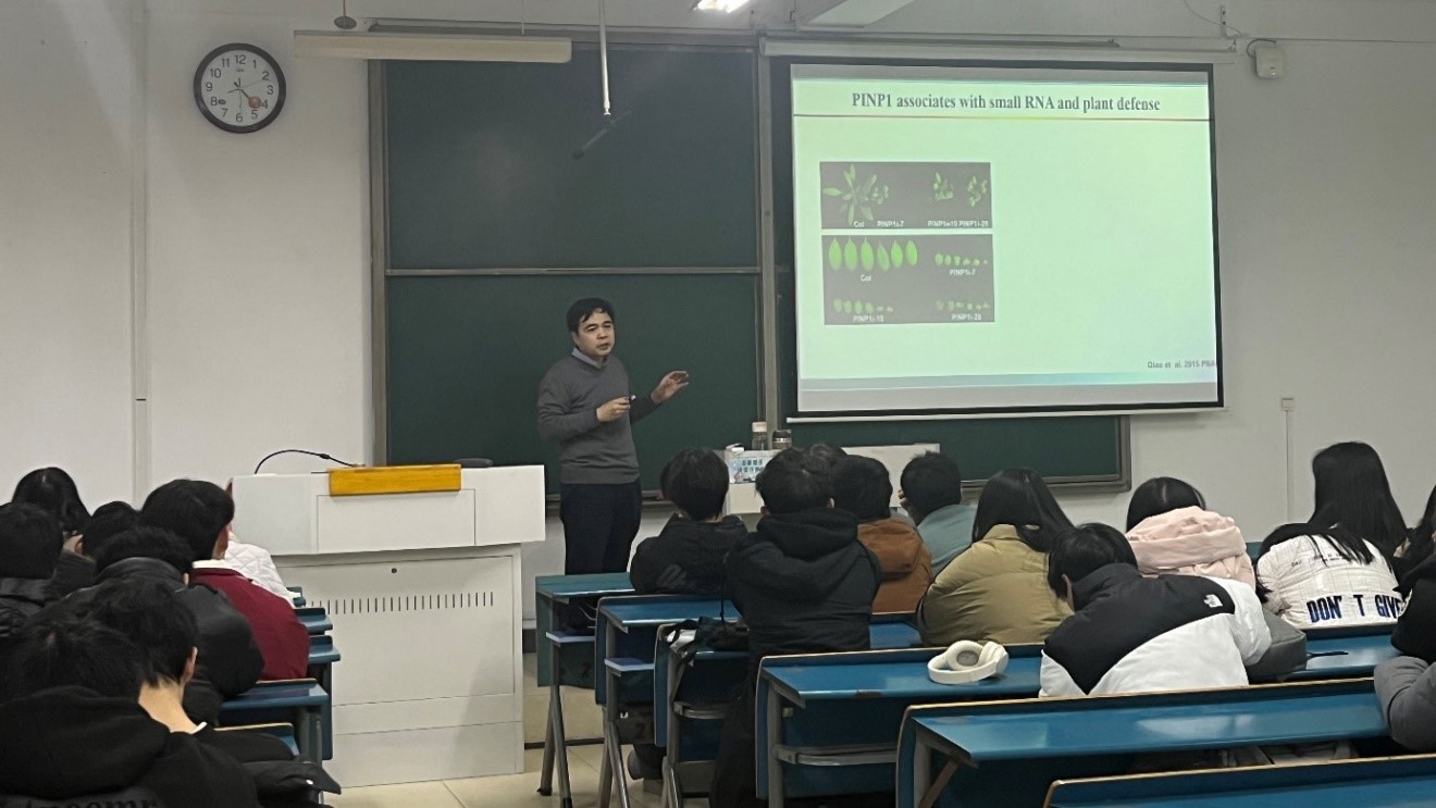 会后,乔永利在我校凤阳校区新知楼A204作了题为《小RNA介导的植物对卵菌抗性研究》的学术报告,农学院和生命与健康科学学院农艺与种业、生物制药等专业约100名师生聆听了报告。(特约通讯员:袁鹏 摄影:闯绍闯 审核:张传德 钱立生 编辑:李锦)