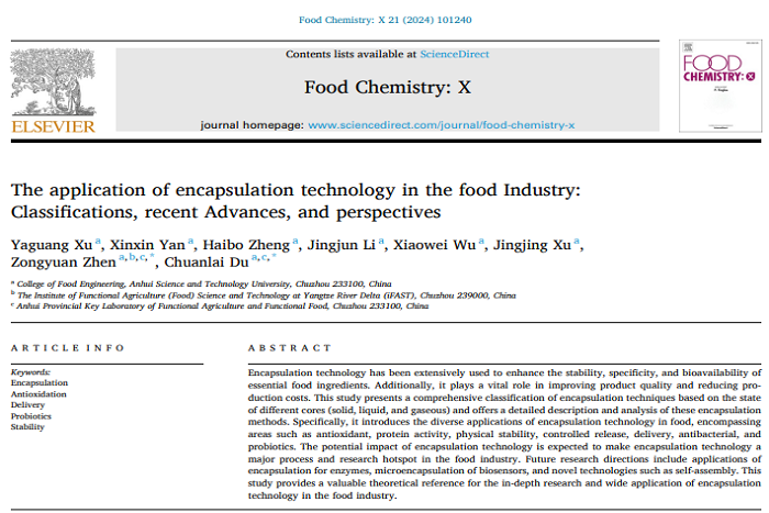 近期,我校食品工程学院动物源食品精深加工与营养团队在中国科学院农林科学领域一区期刊Food Chemistry: X(IF=6.10)在线发表题为“The Application of Encapsulation Technology in the Food Industry: Classifications, Recent Advances, and Perspectives ”的综述论文。食品工程学院2021级食品加工与安全领域硕士研究生徐亚光为第一作者,杜传来教授和甄宗圆副教授为通讯作者,安徽科技学院为第一完成单位。