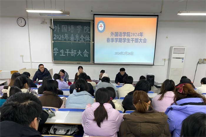 为加强学生干部队伍的凝聚力、战斗力,2月26日晚,外国语学院在求知楼A座106教室召开2024年春季学期学生干部大会。学院党政领导出席会议,全体辅导员,群团组织负责人,各班级班长、团支书、学习委员参加会议。会议由学院党委副书记张海亮主持。