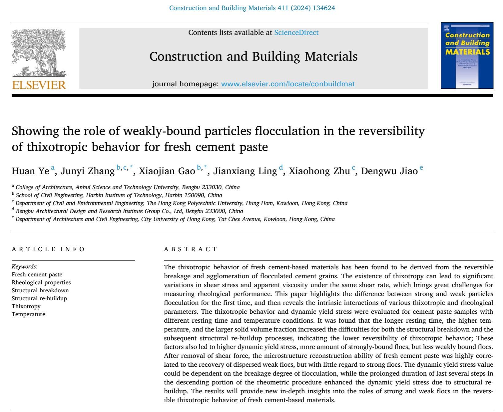 近日,我校建筑学院教师叶焕以第一作者在国际学术期刊《Construction and Building Materials》(中国科学院分区:工程技术1区Top期刊。影响因子:7.4)发表题为“Showing the role of weakly-bound particles flocculation in the reversibility of thixotropic behavior for fresh cement paste”的研究论文。我校为第一完成单位,合作单位为哈尔滨工业大学、蚌埠市建筑设计研究院集团有限公司等。
