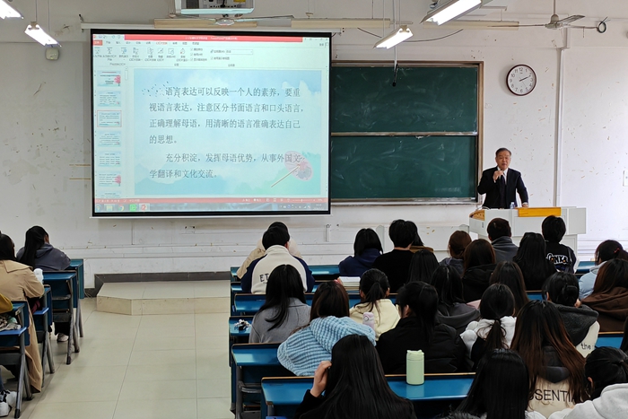 时卫国教授围绕“中国传统文化地理分布研究与传承”主题,从母语文化建设、文化地理研究、学派代表人物等方面进行阐释,重点分析了母语文化建设的重要性,强调语文学习的基础性作用以及传统文化与自然地理的紧密联系。交流互动环节,时卫国与师生就“研究生择校方案”“不同文化下的学术影响”“大学时期的文学积累”等问题展开了热烈的讨论,并送上了鼓励祝福。