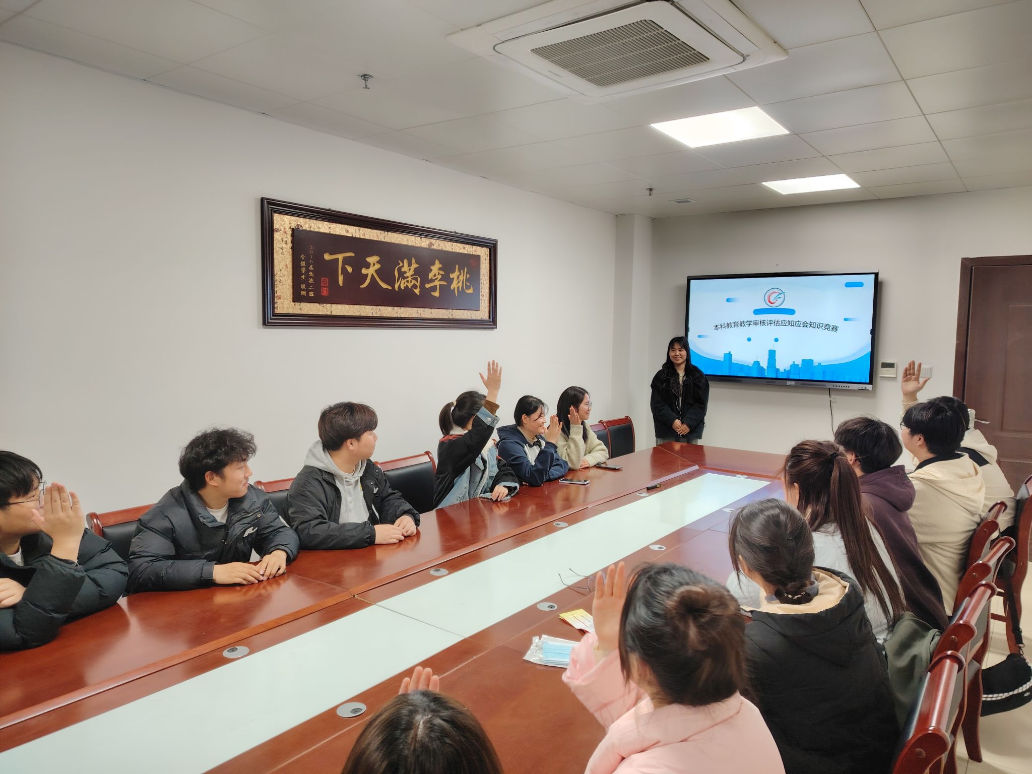 活动伊始,江旭聪简要介绍了新一轮本科教育教学审核评估的相关背景和学校、学院方面正在开展的一些工作。随后,活动进入知识竞答环节,竞赛采取“快问快答”形式,主持人通过PPT设置《应知应会知识手册》中相关问题,同学们可现场举手抢答,抢答成功按积分高低可获取小礼品。比赛过程紧张有序,竞赛现场气氛热烈,同学们以饱满的精神面貌沉着应对、踊跃抢答,充分展现了管院学子对学校本科办学发展的关心关注,也让同学们感受到知识与趣味相结合的魅力,在新颖的活动形式中对新一轮本科教育教学审核评估知识有了更深入地了解。