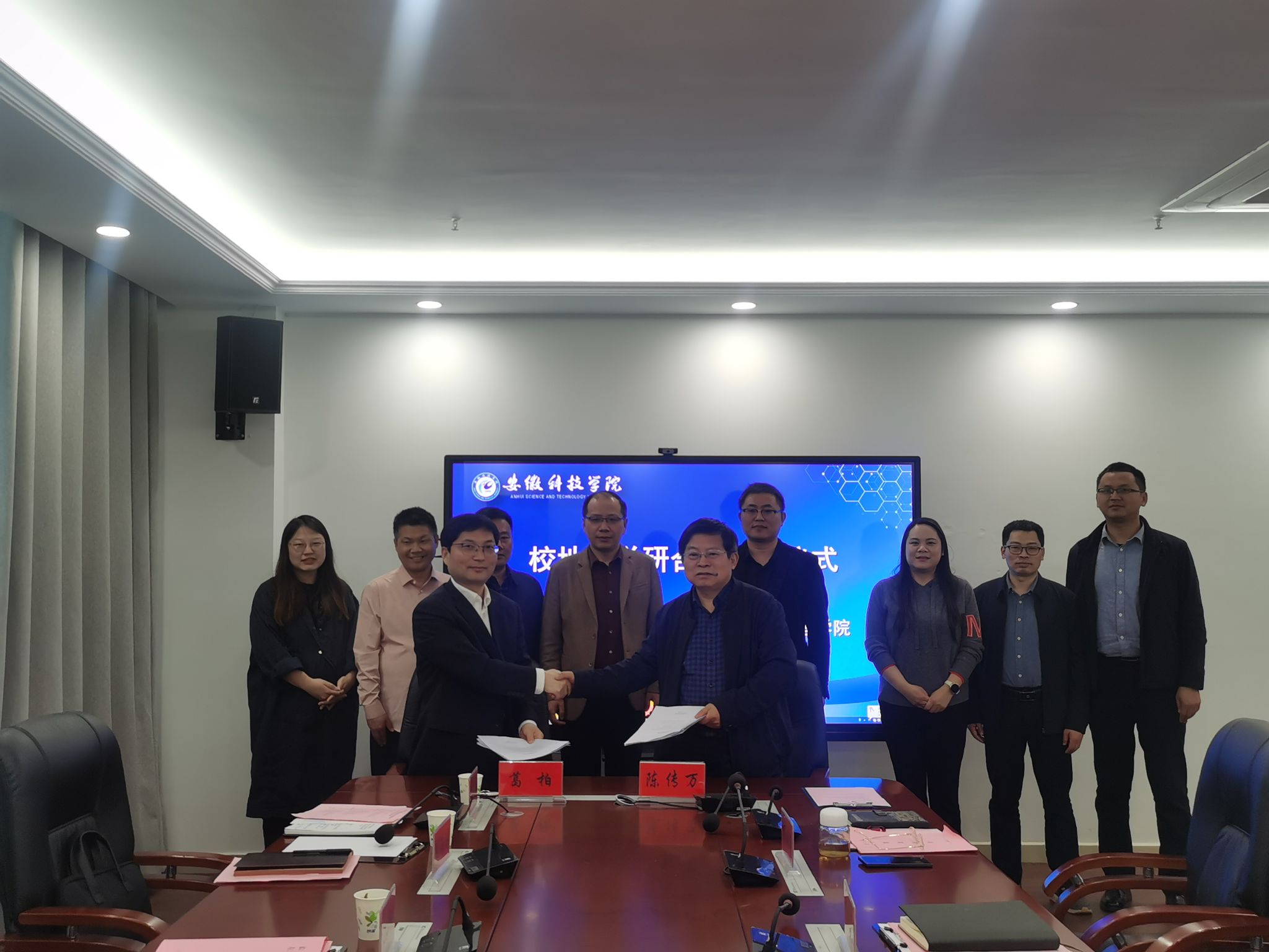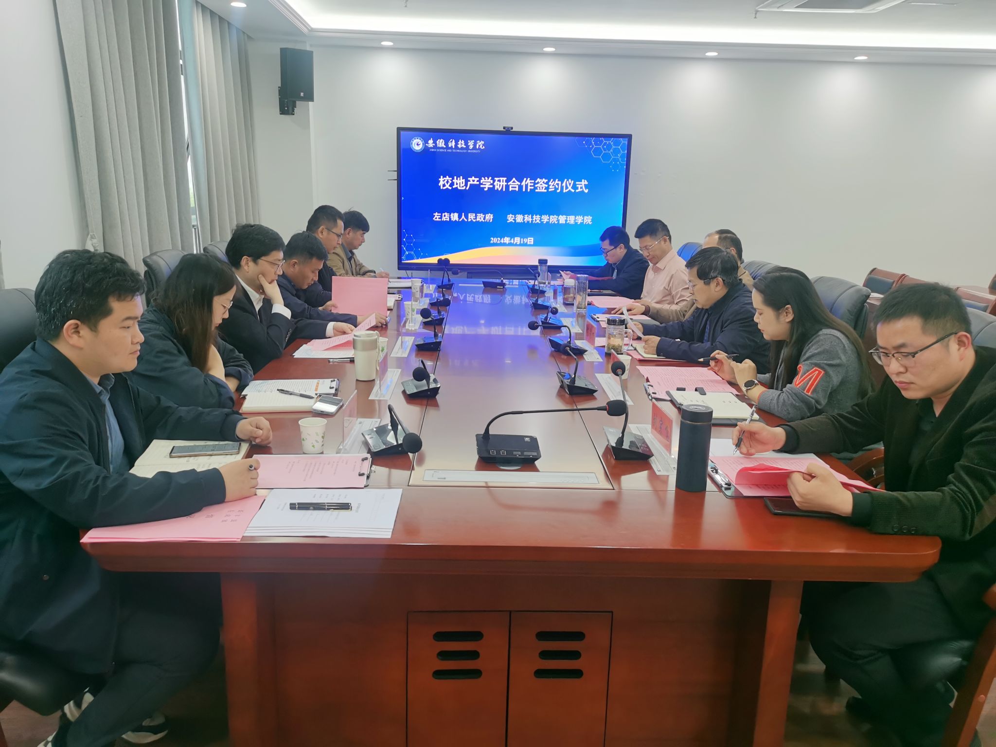 为进一步推动校地融合发展,精准对接我校科技、人才与地方经济发展之间需求度,推动校地产学研用深度融合,4月19日,长丰县左店镇党委书记葛柏,党委副书记杜峰等一行六人应管理学院邀请,来校洽谈校地合作事宜,校科研处副处长刘宗飞,管理学院党委书记丁景良、院长陈传万、副院长郑谦、副院长张国宝,安徽科技学院服务地方发展研究院院长余海兵教授出席签约仪式,仪式由丁景良主持。
