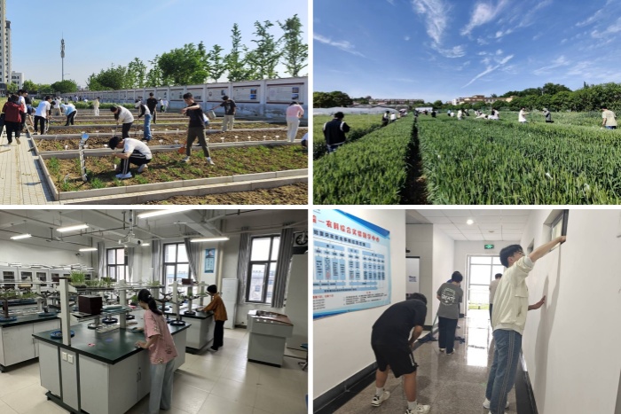 结合专业实际,夯实劳动实践。学院采用专业实践性劳动、日常生活性劳动和志愿服务性劳动相结合的模式,引导和组织学生广泛参与劳动体验,激励学生弘扬劳动品德、培养劳动技能、磨砺奋斗品格。5月8日至9日,农学院组织了别开生面的田间劳动活动。5月10日,农学院在躬行楼三号、四号楼部分楼层,开展了一场实验室打扫实践活动。