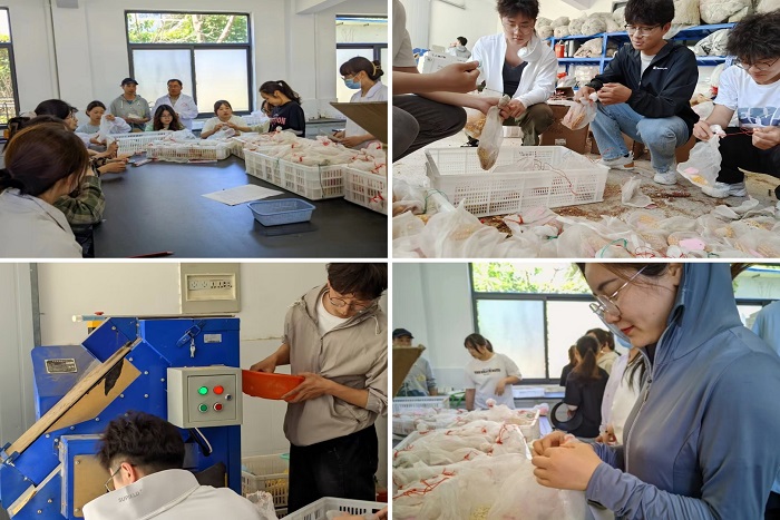 非毕业班党员和发展对象齐聚在西区玉米育种安徽省工程技术研究中心,在研究生的专业指导下投入到玉米品种的脱粒与分装工作中。同志们井然有序地操作着,每一步都遵循着严格的技术要求。他们全神贯注地聆听指导,彼此间相互协作、互相监督。通过一下午的努力同学们顺利完成玉米品种的脱粒和分装工作。