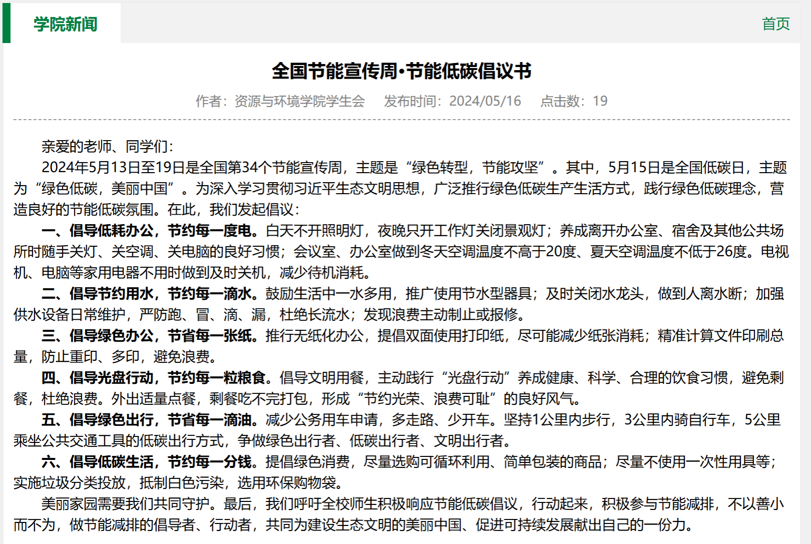 为深入学习贯彻习近平生态文明思想,广泛推行绿色低碳生产生活方式,践行绿色低碳理念,营造良好的节能低碳氛围。资源与环境学院通过官网发起节能低碳倡议:一、倡导低耗办公,节约每一度电;二、倡导节约用水,节约每一滴水;三、倡导绿色办公,节省每一张纸;四、倡导光盘行动,节约每一粒粮食;五、倡导绿色出行,节省每一滴油;六、倡导低碳生活,节约每一分钱。
