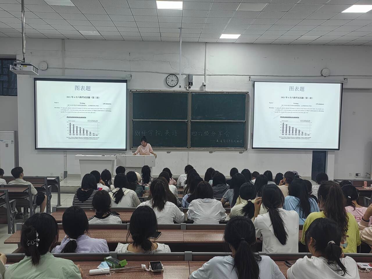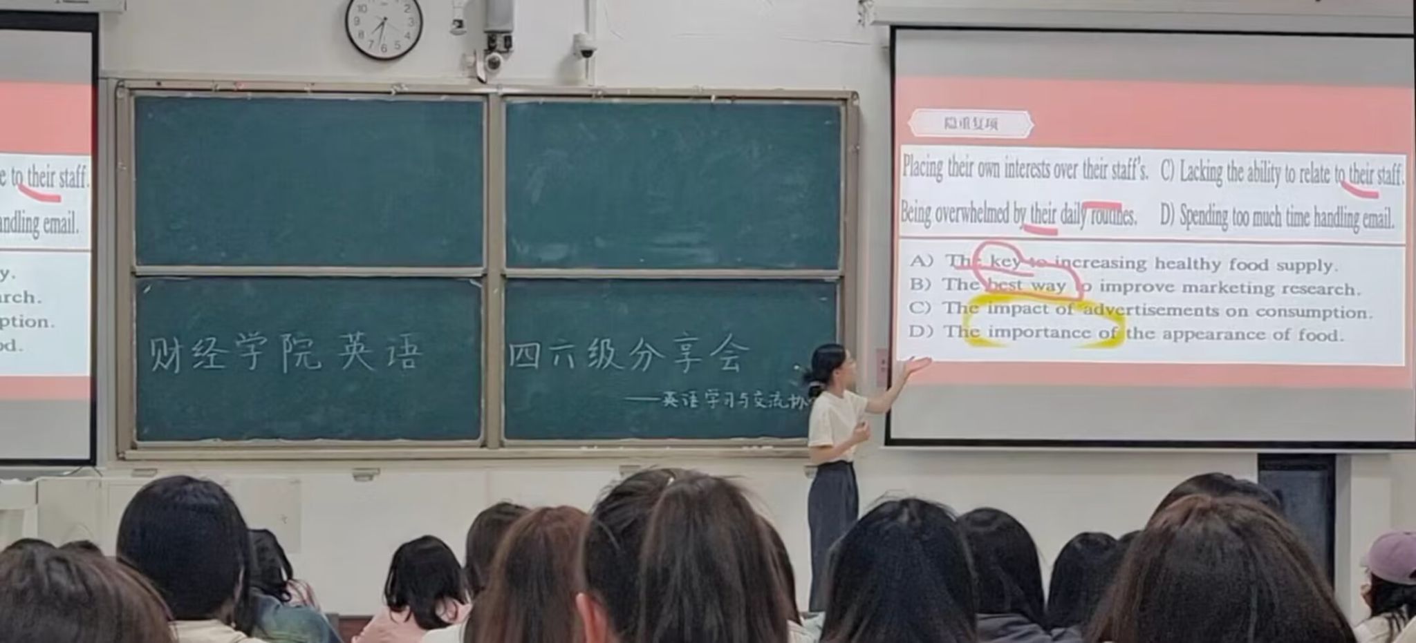 为帮助学生高效备战英语四六级考试,5月21日晚,财经学院在致知楼C111教室举办了英语四六级经验分享会。国际经济与贸易专业211班沈艳雯,会计学专业211班李荣荣两位同学应邀作经验分享。会议由专职辅导员尹成超主持。