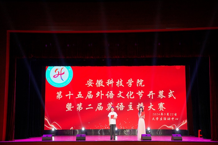 5月22日晚,学校第十五届外语文化节之第二届英语主播大赛在校大学生活动中心成功举办。校国际合作与交流处处长陈德用,农学院党委书记何世潮,外国语学院全体党政领导出席开幕式。校团委组宣部主任张古品、秘书王明浩,校党委学工部(学生处)康佳蓉,食品工程学院党政办主任赵传磊,农学院党政办副主任汪道兵,外国语学院衡鹏、强小云老师担任评委,外国语学院师生、兄弟学院学生代表400余人参加。