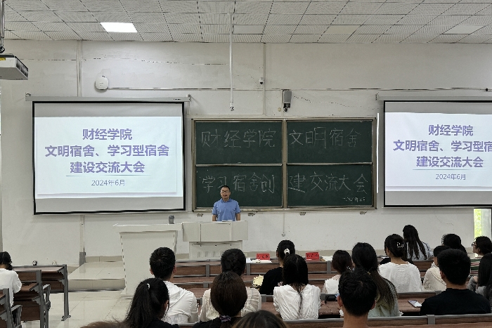 为进一步全面做好学生宿舍管理工作,规范学生宿舍管理内容,不断提升“三全”育人质量,扎实推进寝室文明建设,6月12日,财经学院在致知楼A111召开文明宿舍、学习型宿舍创建交流大会。学院党委副书记耿广汉出席并讲话,学院全体生活委员、2023级寝室长参会。