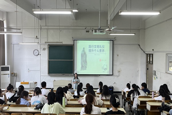 吴玘以“践行文明礼仪,提升个人素质”为题,从办公室礼仪,社交礼仪,电话礼仪,校园礼仪,课堂礼仪,教室礼仪等方面,通过生动的案例和深入浅出地讲解,阐述了践行文明礼仪对于提升个人素质的重要意义。她指出,文明礼仪不仅仅是学生干部外在的行为表现,更是其内在修养的体现。从日常的言行举止到人际交往中的礼貌规范,吴玘逐一剖析,让学生干部深刻认识到文明礼仪在个人成长和发展中的关键作用。