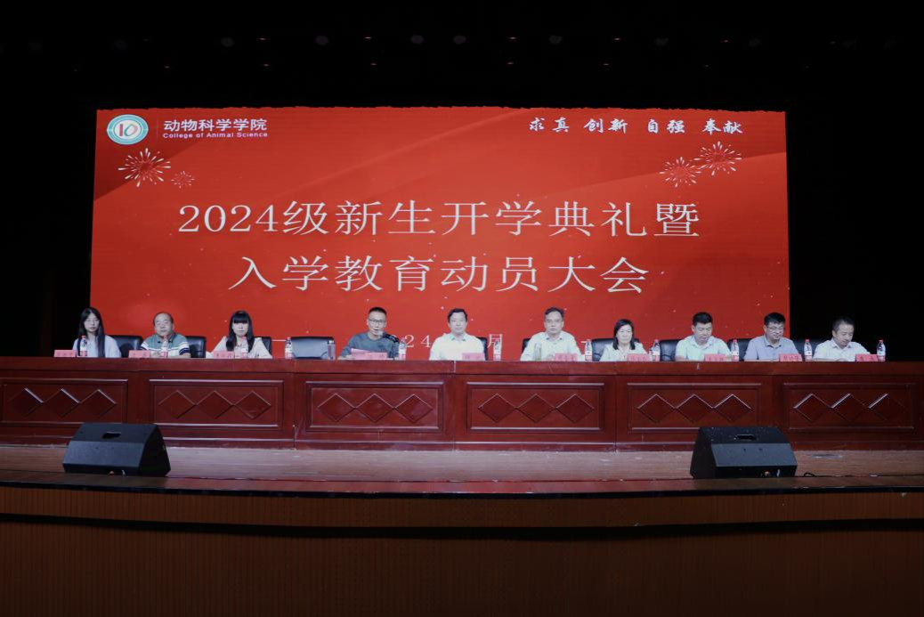 9月24日晚,动物科学学院在大学生活动中心召开2024级新生开学典礼暨入学教育动员大会。学院党委书记程斌,党委副书记、副院长(主持工作)周金星,副院长华金玲,各系(室)主任,全体辅导员,教师代表,2024级全体本科、研究生新生参加本次典礼。大会由学院党委副书记、纪委书记汤帅主持。